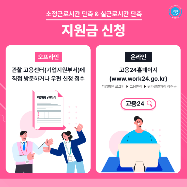 근로자가 육아, 건강, 학업 등의 이유로 근로시간을 단축하더라도, 사업주가 부담을 덜 수 있도록 정부가 지원금을 지급하는 제도가 있습니다!